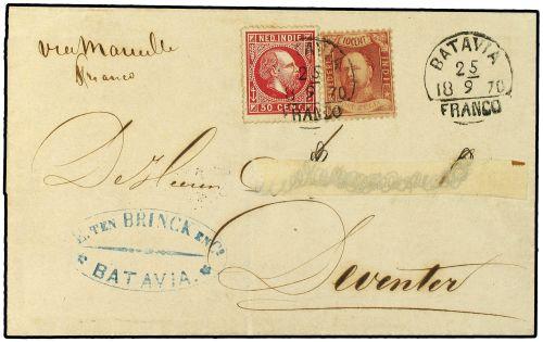 1870 BATAVIA a DEVENTER (Holanda). Franqueo mixto con sello de 10 cent carmín y 50 cts. rosa (NVPH 2 y 5). Texto de la dirección parcialmente borrada. Excepcional franqueo mixto de dos emisiones. Cert. C. MUIS.