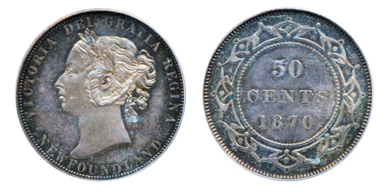 1870. Both PCGS and NGC graded SPECIMEN-65. Plain edge. Medium heavy blue and pearl toning over flawless mirror fields. Cameo bust. A Gem for the advanced collector.