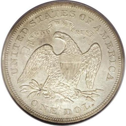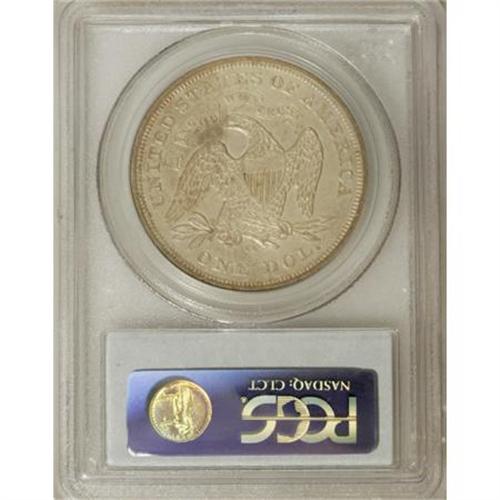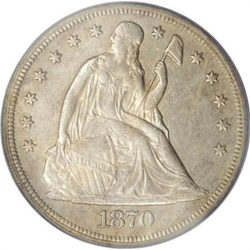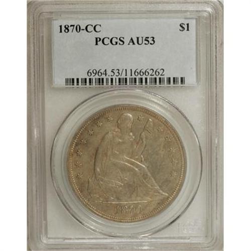 <B>1870-CC $1 AU53 PCGS.</B></I> The Carson City Mint, more famous for its Morgan dollars, struck four issues of Seated silver dollars before the Trade dollar supplanted the denomination. Of those four, the 1870-CC is the most available today, due in part to its mintage of 11,758 pieces. The cloud-gray example offered here has a touch of golden patina on each side. Well struck with minor wear on the highpoints and a degree of remaining luster at the margins. Population: 22 in 53, 63 finer (6/07).<BR><BR><B>Coin Engraver:</B> Christian Gobrecht<BR><BR><b>Shipping:</b> Coins & Currency (<a target="_blank" href="http://www.heritageauctions.com/common/shipping.php">view shipping information</a>\)