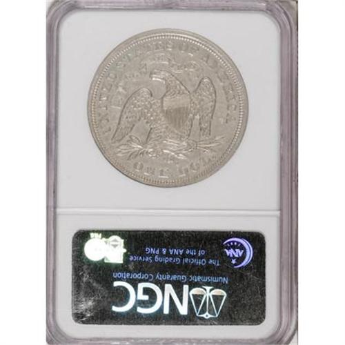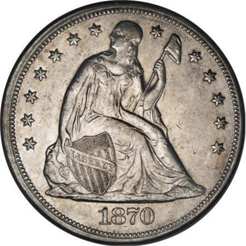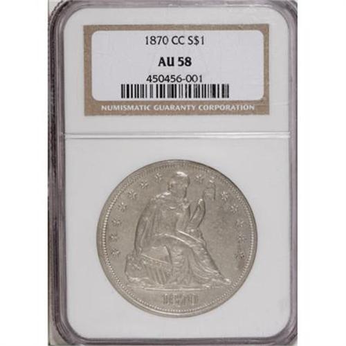 <B>1870-CC $1 AU58 NGC.</B></I> Variety 3-C. The 1870-CC is the first Carson City dollar issue, with the result that many were saved as the first of their kind. This lightly circulated example displays silver-gray surfaces with luster in the recesses. Somewhat better struck than average, with LIBERTY on the shield more prominent than usually seen. A few minor marks are noted.<BR><BR><B>Coin Engraver:</B> Christian Gobrecht<BR><BR><b>Shipping:</b> Coins & Currency (<a target="_blank" href="http://www.heritageauctions.com/common/shipping.php">view shipping information</a>)
