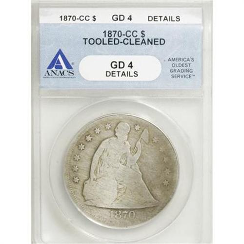 <B>1870-CC $1 --Cleaned, Tooled--ANACS. Good 4 Details.</B></I> NGC Census: (1/146). PCGS Population (1/305). Mintage: 12,462. Numismedia Wsl. Price for NGC/PCGS coin in G4 : $400. (#6964)<BR><BR><B>Coin Engraver:</B> Christian Gobrecht<BR><BR><b>Shipping:</b> Coins & Currency (<a target="_blank" href="http://www.heritageauctions.com/common/shipping.php">view shipping information</a>)