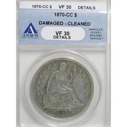 <B>1870-CC $1 --Damaged, Cleaned--ANACS. VF30 Details.</B></I> Variety 3-C. Carson City Seated dollars are all rarer than any Morgan dollar issue from the famed Western facility. The 1870-CC is the most available, yet its mintage of 12,462 pieces ensures its scarcity. Pearl-gray and slightly glossy with a few small digs on the lower obverse. <BR><BR><B>Coin Engraver:</B> Christian Gobrecht<BR><BR><b>Shipping:</b> Coins & Currency (<a target="_blank" href="http://www.heritageauctions.com/common/shipping.php">view shipping information</a>)