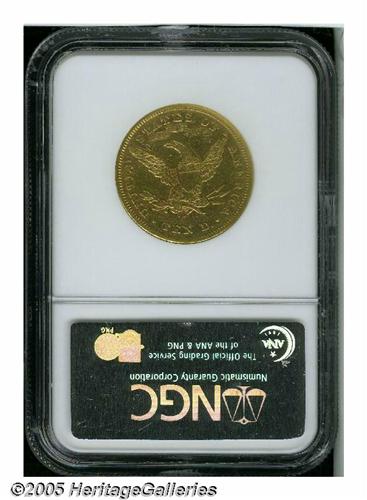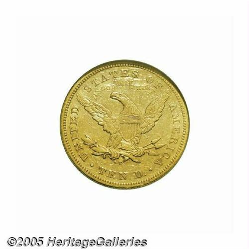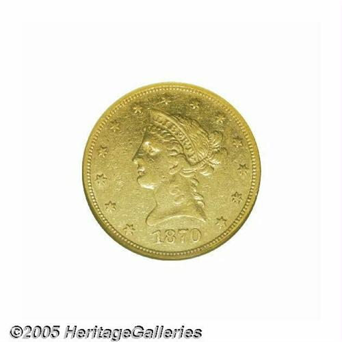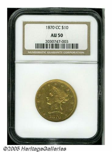 <B>1870-CC<$10> AU50 NGC.</B></I> Variety 1-A. The premier Ten Dollar issue from the Carson City facility and profound rarity among not only Eagles, but all CC gold issues. Starting with a tiny mintage of 5,908 pieces, attrition has taken its toll on all but a few dozen survivors, nearly all of which grade XF or less. Akers states that "only the famous Double Eagle of the same date surpasses the 1870-CC Eagle as the rarest of all Carson City gold coins." This bright, moderately abraded example has the slightest reddish tinge overall and average or better sharpness for this elusive issue. An important Carson City Ten Dollar worthy of consideration by the advanced Western gold or Eagle collector. Population: 5 in 50, 7 finer (6/05).