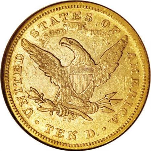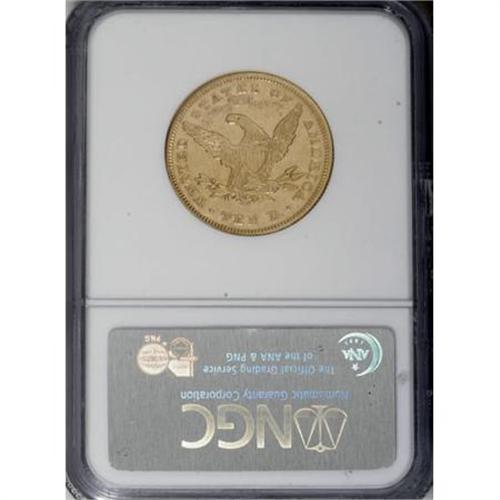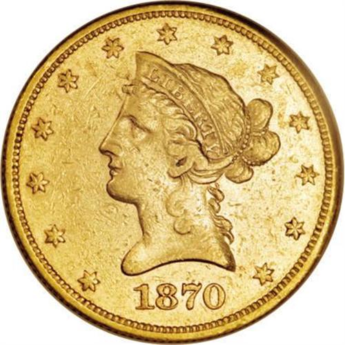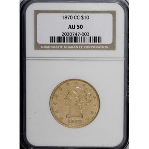 <B>1870-CC $10 AU50 NGC.</B></I> The Carson City, Nevada, Mint opened in 1870 despite financial misgivings and Congressional obstructionism in Washington, striking in its inaugural year the largest three circulating coinage denominations each in gold and silver. Each of the three gold and silver issues is a key within its respective series. Rusty Goe, in The Mint on Carson Street (2003) provides estimates of the surviving members of 1870-CC coins. From rarest to least rare--relatively speaking--the order works out to: quarter dollar (39-49 pieces estimated surviving in all grades); double eagle (45-50 coins); eagle (70-80); half eagle (70-85); half dollar (125-150); and silver dollar (450-650). Goe notes that "At one time (the 1870-CC eagle) was considered rarer than the double eagle issued the same year at the Carson City Mint, however, during the last decade of the 20th century handfuls of unknown examples were introduced onto the market."<BR> The 1870-CC eagle is among the most popular dates in the entire Liberty Head series, and it is the second most valuable date from 1838 to 1907, surpassed only by the legendary 1875 eagle issue. Currently unknown in Mint State or even in AU58, the 1870-CC shows combined population totals at NGC and PCGS of 12 pieces in AU50, six coins in AU53, and five examples in AU55, the finest certified examples now known. Curiously, Goe estimates that a single Mint State piece exists, although Garrett and Guth, more realistically, note that XF examples are rare and AU examples are extremely rare.<BR> The present survivor from the recorded mintage of 5,908 eagles boasts semiprooflike surfaces that show numerous small and scattered abrasions typical of an 1870s CC-mint gold coin, yet they are for the most part undistracting and hardly visible without a loupe. The obverse strike is somewhat soft on the lovelock and hair above the ear. On the reverse, weakness appears in the vertical shield stripes, the left shield corner, the fletchings, and the feathers on the eagle's neck and right (facing) wing. However, the star centrils, the upper hair above the coronet, the beaded hair cord and the bun are well brought up, as are the rest of the details on the eagle. The mintmark is quite small and neatly centered between the left (facing) claw and right tip of the fletchings. <BR> This is a coin of consummate rarity. Whether for the lover of rare gold, for specialists in Carson City coins or CC-mint gold, or indeed even to the non-numismatist who desires to obtain a single U.S. coin of the utmost desirability, this piece represents a special prize that should be afforded ample consideration. Census: 7 in 50, 7 finer (5/07).<BR><BR><B>Coin Engraver:</B> Christian Gobrecht<BR><BR><b>Shipping:</b> Coins & Currency (<a target="_blank" href="http://www.heritageauctions.com/common/shipping.php">view shipping information</a>\)