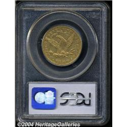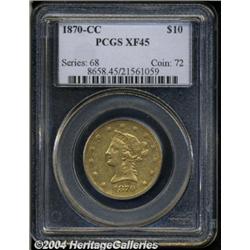 <B>1870-CC<$10> XF45 PCGS.</B></I> Variety 1-A. Simply stated, the 1870-CC Ten Dollar is the key issue among Carson City Eagles and, indeed, a profound rarity in the entire run of CC-mint gold issues. Struck from a tiny mintage of 5,908 pieces, the small number of survivors (25-30 pieces in all) is almost invariably low grade, Fine or Very Fine, topping out with a precious few AUs. Akers states that "only the famous Double Eagle of the same date surpasses the 1870-CC Eagle as the rarest of all Carson City gold coins." This still-lustrous example falls just outside Condition Census for the issue, being generally well detailed and tinged in attractive reddish patina. Abrasions are about on par with what is expected of gold issues from this historic Western Mint. Population: 5 in 45, 6 finer (3/04).<BR><I>From The Barry Donnell Collection.</B></I> <BR><BR><B>Important notice:</B> Heritage usually auctions material at the rate of 200-250 lots per hour. On some occasions eBay Live bid software or the Internet may not be able to keep up with the pace of the auction. We recommend placing a realistic absentee bid now as insurance to avoid disappointment. Occasionally the auctioneer may eliminate or reject an eBay Live bid, and the auctioneer may also reopen a lot after the close of the eBay live bidding (usually because we missed an audience bid), and may reject your bid even if it shows you as the winning bidder. By bidding via eBay Live, you agree that Heritage may award the lot to another bidder at its sole discretion under the circumstances described above or any other reasonable circumstances. Since eBay bids are not shown to us until we open the lot on the floor, we treat those bids just like floor bids. In most cases the floor responds before the eBay bid is presented to us, due to Internet lag time, so for consistency we have made it a policy that floor bids are always considered first over tie eBay live bids. Also please note that all Heritage lots purchased through eBay Live carry a 20% Buyer's Premium. Please make sure you read the Terms and Conditions before you bid.
