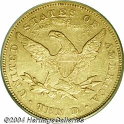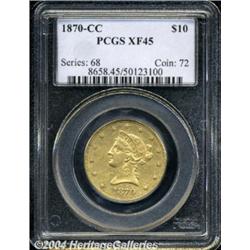 <B>1870-CC<$10> XF45 PCGS.</B></I> Winter-1A. "Of the three gold denominations struck by the Carson City mint, the ten-dollar gold piece or eagle series is the most difficult to collection." So wrote Douglas Winter in <I>Gold Coins of the Carson City Mint,</B></I> which we published in 2001. Factor in the overall rarity, with this coin ranked first, and you have an extremely important opportunity. Winter estimated that only 35 to 45 examples of this issue are known, from a mintage of 5,908 coins. This is a very low survival rate, with these coins circulating extensively in the West after they were minted. This issue is approximately tied with the 1870-CC double eagle for honors as the rarest single coinage issue from this mint. It is also the first gold issue struck in Carson City. Mintage of the eagles began on February 17 of that year, while the first half eagles were coined on March 1, and the first double eagles on March 10, 1870. Further, this was described as a "curiously overlooked" issue.<BR> Both surfaces have pale yellow-gold surfaces with a hint of orange color. The fields are very lightly abraded. All design features are very sharply defined, while the left-hand C in the mintmark is virtually illegible. <BR><BR><B>Important notice:</B> Heritage usually auctions material at the rate of 200-250 lots per hour. On some occasions eBay Live bid software or the Internet may not be able to keep up with the pace of the auction. We recommend placing a realistic absentee bid now as insurance to avoid disappointment. Occasionally the auctioneer may eliminate or reject an eBay Live bid, and the auctioneer may also reopen a lot after the close of the eBay live bidding (usually because we missed an audience bid), and may reject your bid even if it shows you as the winning bidder. By bidding via eBay Live, you agree that Heritage may award the lot to another bidder at its sole discretion under the circumstances described above or any other reasonable circumstances. Since eBay bids are not shown to us until we open the lot on the floor, we treat those bids just like floor bids. In most cases the floor responds before the eBay bid is presented to us, due to Internet lag time, so for consistency we have made it a policy that floor bids are always considered first over tie eBay live bids. Also please note that all Heritage lots purchased through eBay Live carry a 20% Buyer's Premium. Please make sure you read the Terms and Conditions before you bid. </span></font></tr></table></td></tr></table>