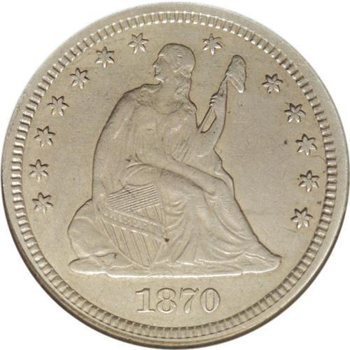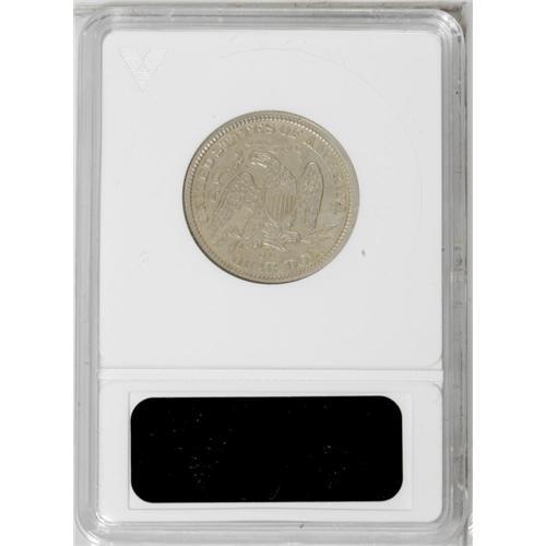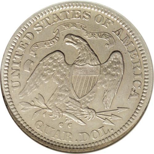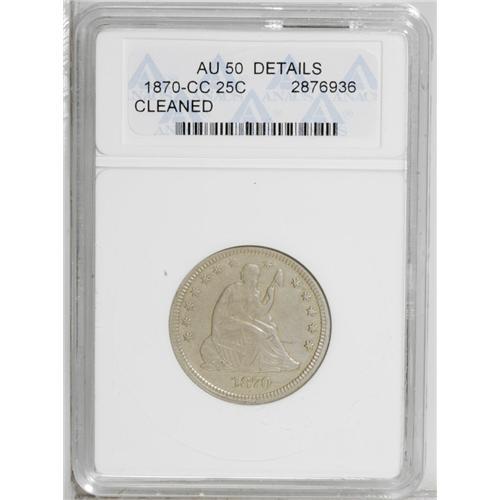 <B>1870-CC<25C>--Cleaned--ANACS. AU50 Details.</B></I> In its introductory year of coinage, the Carson City Mint struck 8,340 Seated quarters. This was a low mintage, although comparable to the 11,758 silver dollars also struck in 1870. Today, however, the quarters are rarely seen, particularly above XF. Meanwhile, most major auctions offer one or more 1870-CC dollars, often in AU or better grades. Perhaps the quarters were used in circulation to a greater extent, while a portion of the silver dollar production was set aside as bank reserves. Only a single Mint State 1870-CC quarter is known today (MS64 NGC), and NGC and PCGS combined have certified only three in AU grades. Thus, a piece with AU sharpness is of major importance. This deep tan-gray example is subdued but has bold definition, and there are no obtrusive marks.
