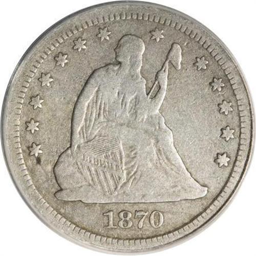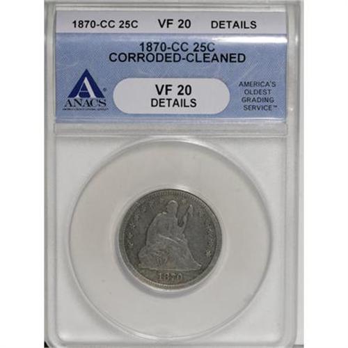<B>1870-CC 25C --Corroded, Cleaned--ANACS. VF20 Details.</B></I> The 1870-CC quarter, like any other coin of the date, is under high demand whenever it is found, regardless of grade. Most are well-circulated, with even pieces worn nearly flat bringing prices well into four figures. The current coin has problems often found on this notoriously poorly produced date, yet presents very nicely as a medium gray, moderately circulated piece. Liberty Seated quarter specialists looking to fill one of the last few holes in their sets would do well to consider this piece.<BR><BR><B>Coin Engraver:</B> Christian Gobrecht<BR><BR><b>Shipping:</b> Coins & Currency (<a target="_blank" href="http://www.heritageauctions.com/common/shipping.php">view shipping information</a>)