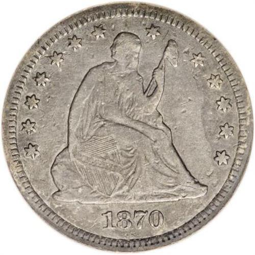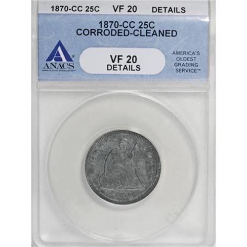 <B>1870-CC 25C --Corroded, Cleaned--ANACS. VF20 Details.</B></I> This example shows ample evidence of harsh cleaning and areas of corrosion near the right obverse and lower reverse borders. The surfaces display deep greenish-gray coloration across both sides. A very important key date in the Seated quarter series that is seldom offered in any condition. <BR><BR><B>Coin Engraver:</B> Christian Gobrecht<BR><BR><b>Shipping:</b> Coins & Currency (<a target="_blank" href="http://www.heritageauctions.com/common/shipping.php">view shipping information</a>)
