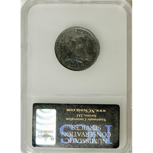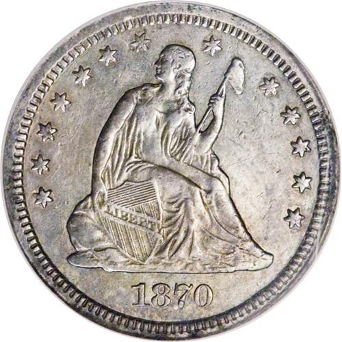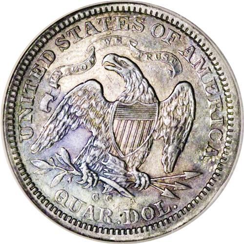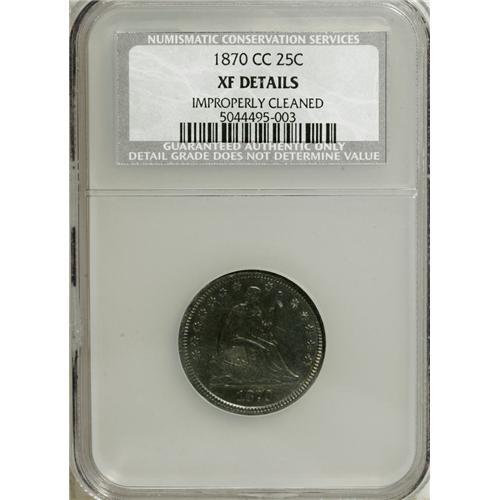 <B>1870-CC 25C --Improperly Cleaned--NCS. XF Details.</B></I> The all-important key date to a Seated Liberty quarter set, the 1870-CC saw a paltry mintage of 8,340 coins in the premier year of coinage at the fabled Carson City Mint. Due to its high value, the 1870-CC is an issue for which authentication is mandatory, although two diagnostics show clearly on genuine coins. A short, straight die line appears beneath the top horizontal of the F in OF on the reverse, which touches the middle serif, and a diagonal die scratch is in the recess behind the eagle's heel. Larry Briggs depicts both in his 1991 <I>Comprehensive Encyclopedia,</B></I> where he comments, "Coins above VF are prohibitively rare with XF or better extremely rare--unknown in Unc." Since that time, however, NGC has certified a single MS64 piece, the Eliasberg coin, which sold for $187,000 in 1997. The present specimen offers pleasing, lightly hairlined fields that retain considerable luster and immense eye appeal. The obverse is a uniform aqua-green while the reverse offer pink and aqua hues. Well struck save for Liberty's head and the upper eagle wings. A more-recent authority, Rusty Goe's <I>The Mint on Carson Street,</B></I> (2003), estimates two Mint State survivors, with 39 to 49 pieces in all grades and about eight to 11 pieces in XF to AU. Alert Seated Liberty quarter specialists will need no further explication.<BR><I>From The Southland Collection.</B></I><BR><BR><b>Shipping:</b> Coins & Currency (<a target="_blank" href="http://www.heritageauctions.com/common/shipping.php">view shipping information</a>)