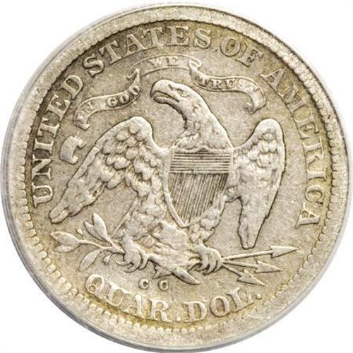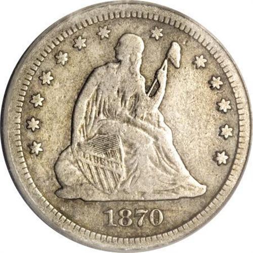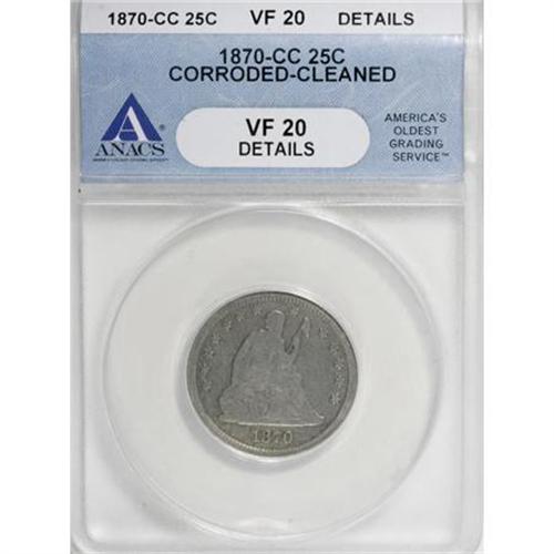 <B>1870-CC 25C --Corroded, Cleaned--VF20 Details ANACS.</B></I> The 1870-CC quarter, like any other coin of the date, is under high demand whenever it is found, regardless of grade. Most are well-circulated, with pieces worn nearly flat bringing prices well into four figures. The current coin has problems often found on this notoriously poorly produced date, yet presents very nicely as a medium gray, moderately circulated piece. Seated Liberty quarter specialists looking to fill one of the last few holes in their sets would do well to consider this piece.<BR><BR><B>Coin Engraver:</B> Christian Gobrecht<BR><BR><b>Shipping:</b> Coins & Currency (<a target="_blank" href="http://www.heritageauctions.com/common/shipping.php">view shipping information</a>)