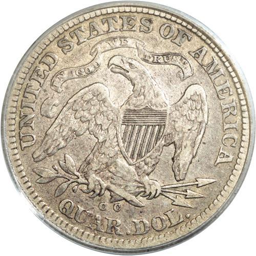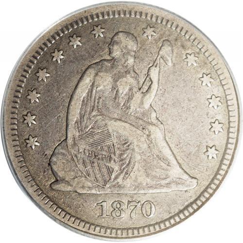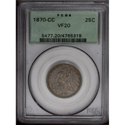 <B>1870-CC<25C> VF20 PCGS.</B></I> Despite its favored status among numismatists today, the Carson City Mint did not lead a charmed life. After several years of operation as an assay office and numerous delays, the institution finally received its first dies from Philadelphia on January 10, 1870. It seems only natural today that the first products of the western branch mint were 2,303 silver dollars that the facility delivered on February 11. While production of this denomination remained minimal through 1872, the Mint Act of 1873 and, in particular, the Bland-Allison Act of 1878 would keep the facility quite busy producing Trade and Morgan dollars through its closure in 1893. Although production of this staple coin would suffer the ups and downs of political meddling, the cartwheel's life on the frontier was idyllic in comparison to the smaller silver denominations.<BR> On April 20, 1870, the Carson City Mint struck its first 3,540 Liberty Seated quarters. By the end of the year, another 4,800 pieces would follow for a grand total of only 8,340. From this tentative beginning, the relationship between the quarter dollar and the Nevada branch mint was an unhappy one. The political foes of the silver lobby in Washington, D. C. conspired ceaselessly to keep Carson City's production levels as low as possible. The meager figures could then be used as an effective argument for closing the branch mint whose contribution to circulating coinage did not justify its operating costs. As the high consumer prices on the frontier confirmed the importance of the silver dollar as a circulating medium of exchange, the officials at Carson City allocated the majority of their silver bullion to that denomination. Although quarter production at the facility would increase dramatically in 1876 and 1877, in 1878, just as the mint was entering the glory days of the Bland-Allison Act and the Morgan dollar, the last 996,000 quarters emerged from its presses.<BR> Despite their meager production levels, the CC-mint Seated quarters saw widespread and heavy circulation on the frontier. The low mintage issues of the early 1870s were, of course, the hardest hit by this commercial attrition. The 1870-CC is easily the rarest collectible issue in the entire Seated quarter series, with only one example, a PCGS MS64 thus far certified in Mint State. While most extant survivors are apt to be heavily worn and/or plagued by numerous impairments, the present specimen is significant for its superior eye appeal and technical quality. Despite moderate overall wear, the devices evidence noteworthy detail for the median circulated grade. Both the obverse and the reverse exhibit scattered circulation marks beneath the lilac-gray toning. One small group of abrasions is noted below star 13 and Liberty's foot, this only being mentioned for future pedigree purposes. An important issue, this pleasing specimen should elicit strong bids from both Carson City enthusiasts and Seated quarter collectors.<BR><I>From The Steve Glenn Collection.</B></I>