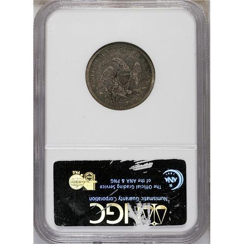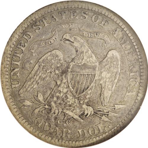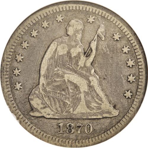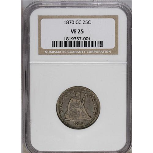 <B>1870-CC<25C> VF25 NGC.</B></I> The 1870-CC Seated quarter is the rarest collectible date in the entire series, behind the 1873-CC, No Arrows issue, of which about five pieces are known. Authentication is absolutely essential for this rare issue, as counterfeits are known with attached mintmarks. This example shows two diagnostics of genuine pieces as outlined in Larry Briggs' Seated Liberty quarter <I>Encyclopedia,</B></I> namely a small, horizontal die scratch, underneath the top crossbar of the F in OF, that touches the middle serif; and a light die scratch in the recessed area behind the eagle's heel. The two C's in the mintmark are widely separated, with the tip of the fletchings near the first C. The surfaces are medium gray, with lighter silver-gray highpoints. Few consequential abrasions are seen, save for a pair of reeding marks on Liberty's torso. Seated Liberty quarter collectors will recognize this opportunity, and act accordingly.