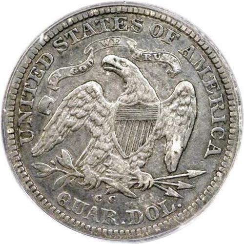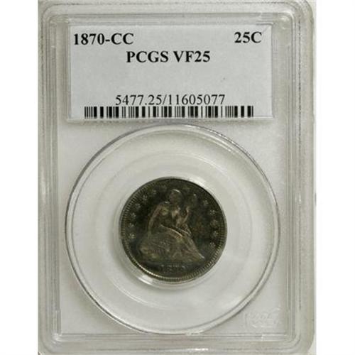 <B>1870-CC 25C VF25 PCGS.</B></I> A single set of dies were employed to produce the 1870-CC Seated quarter. The minuscule mintage of 8,340 pieces is the second lowest in the entire series behind the 1873-CC. However, the 1873-CC is considered non-collectible as most of the mintage was melted shortly after striking and today only 5 examples are known to exist. As such, the 1873-CC is unobtainable by most collectors, and by default the 1870-CC the most challenging regular issue in the Seated quarter series. Breen relates in his <I>Complete Encyclopedia</B></I>: "CC-mint coins 1870-73 are of great rarity in all grades, because issues were deliberately kept limited for political reasons by official policy emanating from the Philadelphia Mint – which limitation was in turn urged as reason for abolishing the Carson City branch!" For collectors today, the limited production of 1870-CC quarters presents a problem. Unfortunately, that difficulty is exacerbated by the fact that few coins of this issue were saved and all examples known today are well-circulated, save for a solitary MS64 graded by NGC, which is the Eliasberg specimen. This piece shows deep gray-olive toning over both sides with the highpoints only slightly lighter in hue. Even wear on each side, there are a few shallow field marks to the right of Liberty. Population: 4 in VF25, 22 finer (6/07).<BR><BR><b>Shipping:</b> Coins & Currency (<a target="_blank" href="http://www.heritageauctions.com/common/shipping.php">view shipping information</a>)