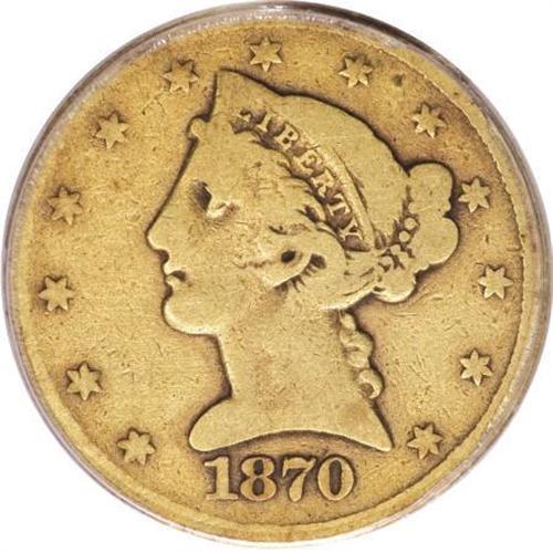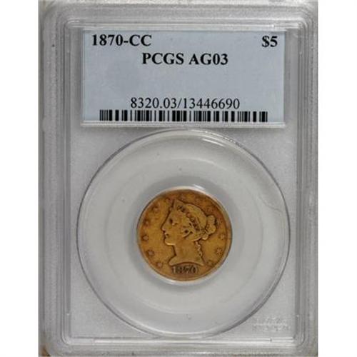 <B>1870-CC $5 AG3 PCGS.</B></I> As is also the case for the double eagle and eagle, the first-year 1870-CC is the rarest Carson City half eagle. Mintages were slightly lower in 1873 and 1876, but more examples of those dates have survived, probably because they circulated additional years in the Western frontier. This golden-brown example has a bold date and mintmark. About half of the letters in UNITED, AMERICA, and FIVE D are worn into the rim.<BR><BR><B>Coin Engraver:</B> Christian Gobrecht<BR><BR><b>Shipping:</b> Coins & Currency (<a target="_blank" href="http://www.heritageauctions.com/common/shipping.php">view shipping information</a>)