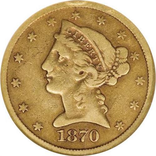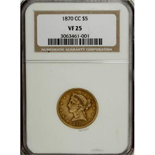 <B>1870-CC $5 VF25 NGC.</B></I> Carson City struck just 7,675 half eagles in its first year of operation, and survivors in all grades are prized by collectors today. This moderately worn example has deep reddish-gold fields, while the devices have a lighter orange-gold appearance. An attractive piece that was likely pressed into heavy service from the day it was minted, like the vast majority of half eagles from this issue. Census: 2 in 25, 26 finer (7/07).<BR><BR><B>Coin Engraver:</B> Christian Gobrecht<BR><BR><b>Shipping:</b> Coins & Currency (<a target="_blank" href="http://www.heritageauctions.com/common/shipping.php">view shipping information</a>\)