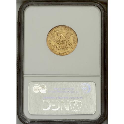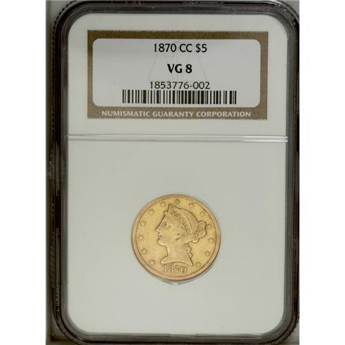 <B>1870-CC $5 VG8 NGC.</B></I> The 1870-CC is the rarest Carson City half eagle, due to its early date and a minuscule production of 7,675 pieces. Its association with the very rare 1870-CC eagle and double eagle also contributes to its mystique. This unblemished but worn example has a bold LIBERTY, and the left wing retains some feather definition.<BR><BR><b>Shipping:</b> Coin/Currency (<a target="_blank" href="http://www.heritageauctions.com/common/shipping.php">view shipping information</a>)