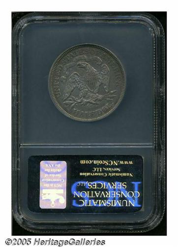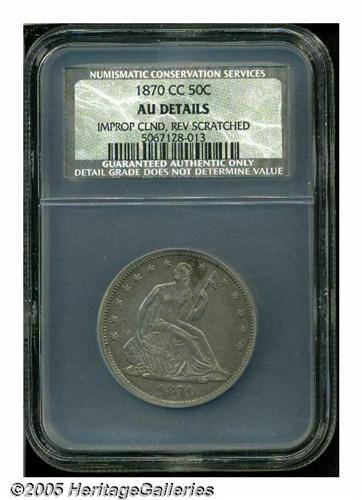 <B>1870-CC<50C> AU Details, Improperly Cleaned, Reverse Scratched, NCS.</B></I> The 1870-CC is one of the most highly regarded of all Seated Half Dollar issues. This in great part is due to its absolute scarcity in all grades, but also because of its first year status from the popular Carson City mint. It is probably the most challenging Carson City Half Dollar in terms of overall rarity (although the 1878-CC is a close rival), and it is unquestionably the rarest in high grades. This modestly circulated survivor has a medium steel-gray appearance with a couple of noticeable scratches laterally on the reverse.