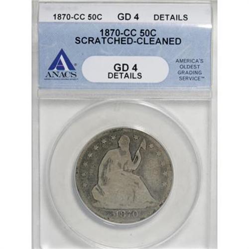 <B>1870-CC 50C --Scratched, Cleaned--ANACS. Good 4 Details.</B></I> Light gray patina dominates both sides of this Carson City issue. Lightly cleaned surfaces reveal a couple of obverse pinscratches and one on the reverse.<BR><I>From The John Stimson, Sr. Collection, Part Two.</B></I><BR><BR><B>Coin Engraver:</B> Christian Gobrecht<BR><BR><b>Shipping:</b> Coins & Currency (<a target="_blank" href="http://www.heritageauctions.com/common/shipping.php">view shipping information</a>)