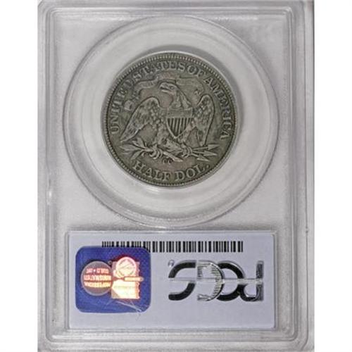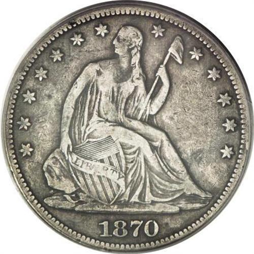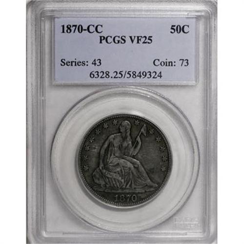 <B>1870-CC 50C VF25 PCGS.</B></I> In its inaugural year of operation, the Carson City Mint struck 54,617 half dollars. This quantity appears reasonable, but none were saved, and most circulated extensively. PCGS has certified one piece as Poor 1, and has certified more examples as Good 4 than have been certified as Mint State by PCGS and NGC combined. This steel-gray example has a hint of peripheral granularity, but marks are limited to a trivial obverse rim nick at 3 o'clock. Population: 5 in 25, 34 finer (2/08).<BR><I>From The Yoder Family Collection, Part One.</B></I><BR><BR><B>Coin Engraver:</B> Christian Gobrecht<BR><BR><b>Shipping:</b> Coins & Currency (<a target="_blank" href="http://www.heritageauctions.com/common/shipping.php">view shipping information</a>)