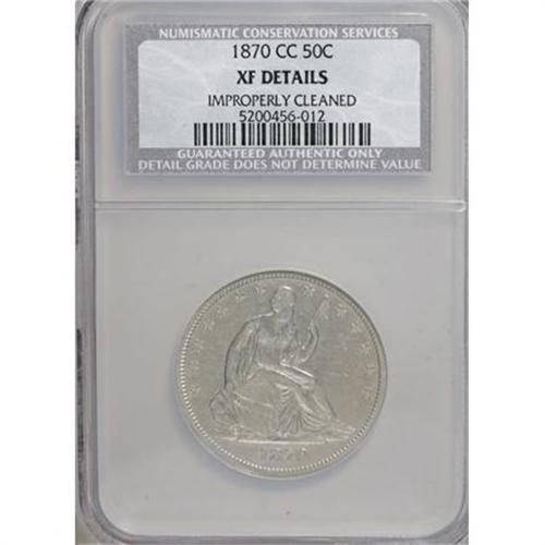 <B>1870-CC 50C --Improperly Cleaned--NCS. XF Details.</B></I> As the first half dollar issue from the Carson City Mint, the 1870-CC spent the most time in circulation before securing collector value. As a result, survivors are very scarce and are usually well circulated. This example is subdued by a cleaning, but no marks merit mention and only the E in LIBERTY is faint.<BR><BR><B>Coin Engraver:</B> Christian Gobrecht<BR><BR><b>Shipping:</b> Coins & Currency (<a target="_blank" href="http://www.heritageauctions.com/common/shipping.php">view shipping information</a>)