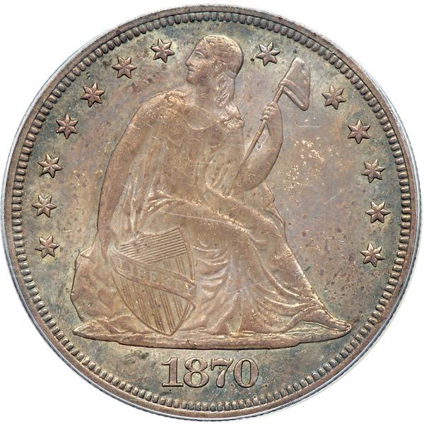 1870-CC Liberty Seated Dollar. PCGS graded MS-63. Deeply toned with reflective surfaces peaking thru. Established by act of Congress on March 3, 1863, the Carson City Mint was ready for coinage operations by December 1869. Even 1869-dated dies had arrived at that facility from the Engraving Department in the Philadelphia Mint by October 21 of that year. Nevertheless, coinage did not begin until the following year with a delivery of 3,747 Silver Dollars on February 10, 1870. A further 8,011 pieces were struck for a total 1870-CC mintage of 11,758 coins.