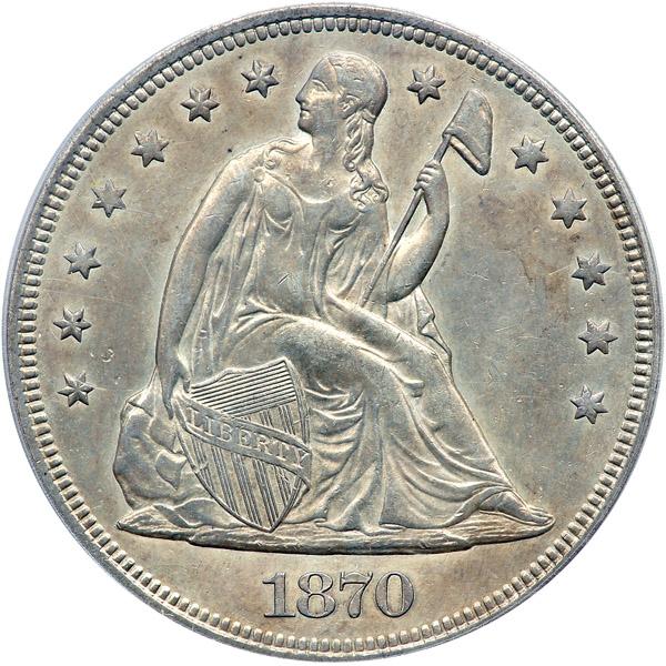 1870-CC PCGS graded Genuine. Sharpness of Choice AU. Cleaned long ago. Only 11,758 struck (fewer than the famous 1907 $20 High Reliefs!) Now that a century plus 40 years has elapsed since the Mint at Carson, Nevada first started striking silver dollars, comes this delightful boldly struck and lustrous 1870-CC for connoisseurs to enjoy and dream about. The cleaning was lightly done, with little evidence of it today since the fields and devices are beginning to tone naturally, which silver will do if allowed to work its magic over the years. Note the crisp detail in Liberty (including her hair). Note the full resolution of the shield lines, both "chief" - the horizontal lines and stripes. Since this example is consistent in every way from a full blow by the dies, the reverse carries over with similar sharpness on the eagle's feathers at the neck, wings, and both legs; so too are there full feel and claws. The second shield, the one on its breast, is similarly finely detailed. The CC mintmark tucks close to the olive branch stem on 1870-CC. Full complete rims without injury. Smooth surfaces. Give it a bid worthy of its historic significance as America's first silver dollar issue from this far Western mint (PCGS # 6964) .