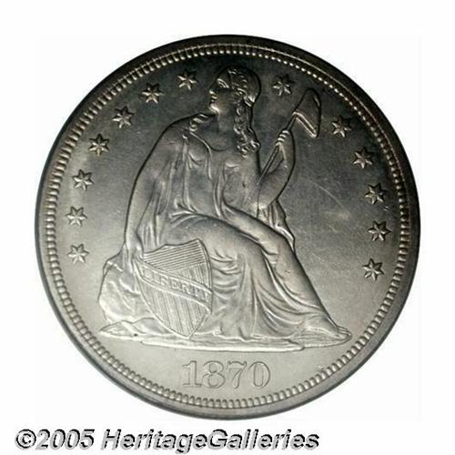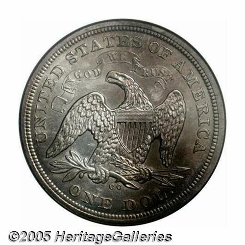 <B>1870-CC<S$1> AU Details, Whizzed, NCS.</B></I> While the 1870-CC is the most "common" of the Carson City Seated Dollars, it has an unmistakable allure as a coin from the first year of production from this popular Western mint. Only 11,758 pieces were struck and very few high grade examples are known today. This piece displays the unnaturally bright surfaces one would expect from whizzing; otherwise, there are no remarkable abrasions on either side. The obverse is essentially brilliant, a thick swath of golden-brown color bisects the reverse. Its too bad someone tried to "improve" this coin by cleaning it as it would have been a sharp, unmolested AU example otherwise.