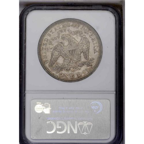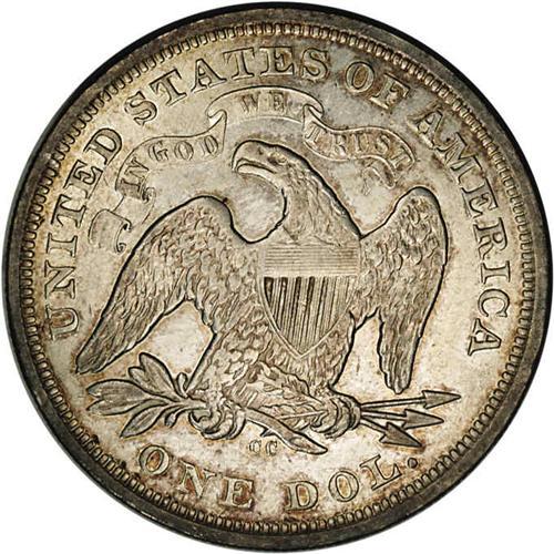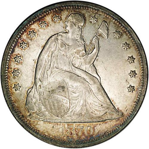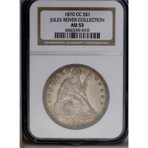 <B>1870-CC<S$1> AU53 NGC.</B></I> Breen-5485, "Rare." Variety 3-A. The CC mintmark is closely spaced. Attractive golden-brown and slate-gray toning embraces the lightly marked surfaces. The fields have a few wispy hairlines, and an area of mint-made roughness is noted left of the pole beneath the shoulder. The "A" reverse is generally regarded as the rarest of the five reverse dies for the 1870-CC, however, Heritage auction appearances suggest that the "B" reverse is even more elusive. The 1870-CC is the most available of the four CC-mint issues of the Seated type, but it is nonetheless of considerably greater rarity than any CC-mint Morgan Dollar, especially in Mint State. The 1870-CC is also famous as the first issue struck by the Carson City Mint.