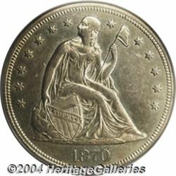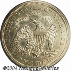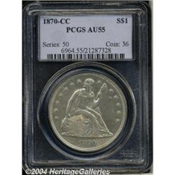 <B>1870-CC<S$1> AU55 PCGS.</B></I> Sharply struck and well detailed, this lightly circulated example is from a notoriously scarce issue, which is even tougher than its low mintage of 11,758 would suggest. The smooth, lightly abraded surfaces display some hairlines, along with pleasing light olive-gold color. The most notable surface blemish is a scrape in the upper right obverse field, just to left of star 10. A tan toning spot resides on the lower reverse rim, above the E in ONE. Modest luster helps to provide a nice degree of eye appeal. Population: 28 in 55, 26 finer (3/04).<BR><I>From The Del Rio Collection, Part One.</B></I> <BR><BR><B>Important notice:</B> Heritage usually auctions material at the rate of 200-250 lots per hour. On some occasions eBay Live bid software or the Internet may not be able to keep up with the pace of the auction. We recommend placing a realistic absentee bid now as insurance to avoid disappointment. Occasionally the auctioneer may eliminate or reject an eBay Live bid, and the auctioneer may also reopen a lot after the close of the eBay live bidding (usually because we missed an audience bid), and may reject your bid even if it shows you as the winning bidder. By bidding via eBay Live, you agree that Heritage may award the lot to another bidder at its sole discretion under the circumstances described above or any other reasonable circumstances. Since eBay bids are not shown to us until we open the lot on the floor, we treat those bids just like floor bids. In most cases the floor responds before the eBay bid is presented to us, due to Internet lag time, so for consistency we have made it a policy that floor bids are always considered first over tie eBay live bids. Also please note that all Heritage lots purchased through eBay Live carry a 20% Buyer's Premium. Please make sure you read the Terms and Conditions before you bid. </span></font></tr></table></td></tr></table>