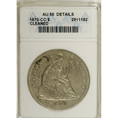 <B>1870-CC S$1 --Cleaned--ANACS. AU58 Details.</B></I> The 1870-CC Seated dollars are notable in the history of U.S. numismatics as the first coins struck at the fabled Carson City Mint in Nevada, which was completed by December 1869. Although 1869-dated dies were sent by the Philadelphia Mint to Carson City, no 1869-CC coins of any denomination are known to have been struck. This piece shows a few light abrasions and field chatter consistent with a short spate in circulation, but despite ANACS' caution the surfaces are pleasing, even if a bit bright.<BR><BR><b>Shipping:</b> Coins & Currency (<a target="_blank" href="http://www.heritageauctions.com/common/shipping.php">view shipping information</a>)