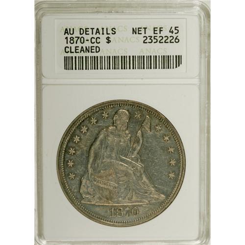 <B>1870-CC S$1 --Cleaned--ANACS. AU Details, Net XF45.</B></I> This blue-violet and rose example of the first Carson City silver dollar issue has slight wear on the highpoints. While the glossy fields exhibit a few handling marks and hairlines, the coin retains significant eye appeal.<BR><BR><b>Shipping:</b> Coins & Currency (<a target="_blank" href="http://www.heritageauctions.com/common/shipping.php">view shipping information</a>)