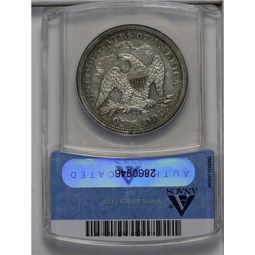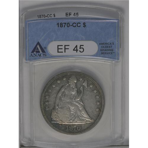 <B>1870-CC<img border='0' src='http://www.heritagecoins.com/images/star.gif' width=10 height=10>$1> XF45 ANACS.</B></I> Variety 2-E. The 1870-CC is relatively available given its low mintage of 12,462 pieces, but survivors are in demand to represent the Carson City Seated dollar type. This bright example retains noticeable luster and features peripheral orange and electric-blue toning.