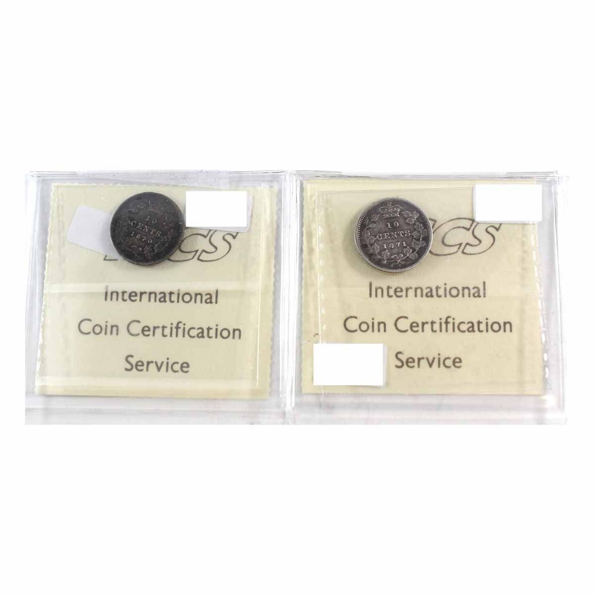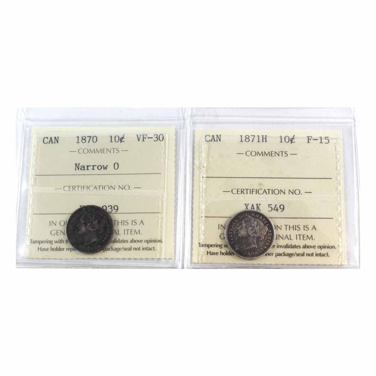 1870 Canada 10-cent Narrow 0 ICCS Certified VF-30 & 1871H F-15. 2pcs