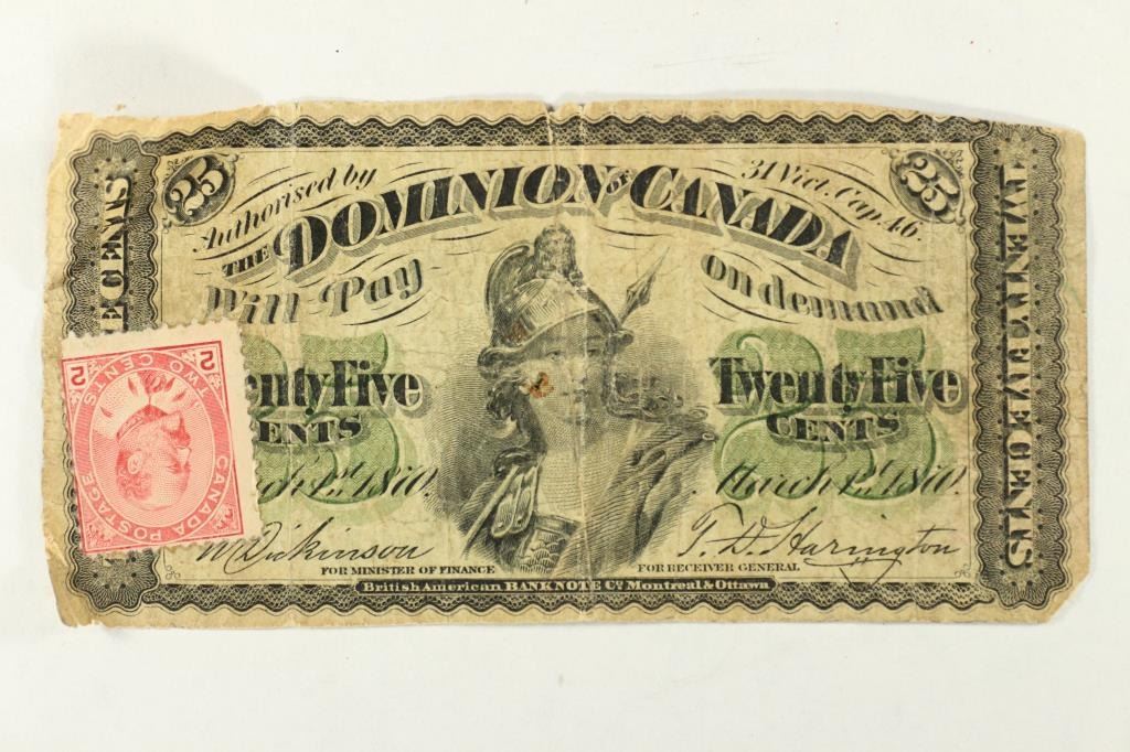 CURRENCY WITH 2 CENT CANADA POSTAGE AFFIXED