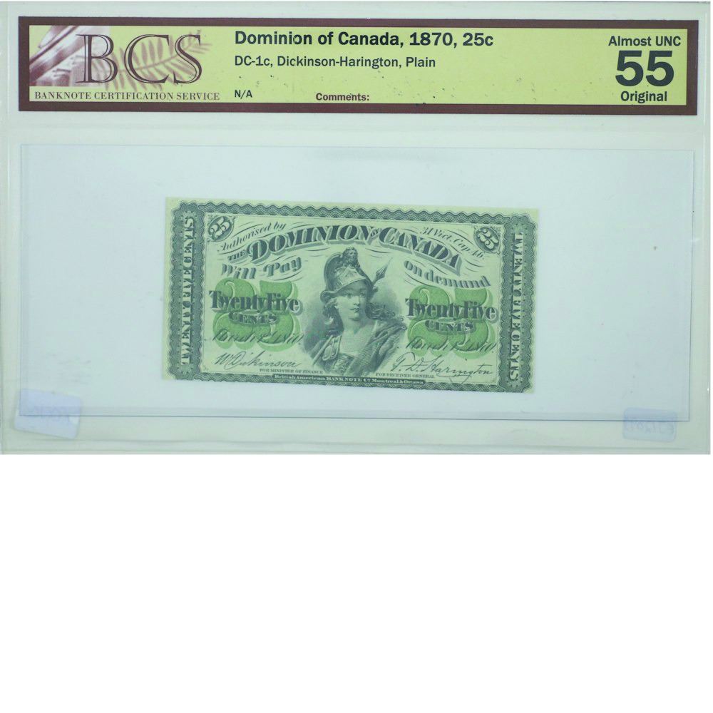 1870 Dominion of Canada 25c. DC-1c, Plain Series, BCS AU-55, Original.
