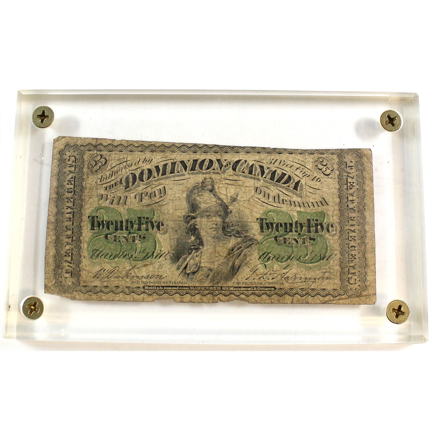 1870 Dominion of Canada 25c Shinplaster Note in Acrylic Slab Holder.