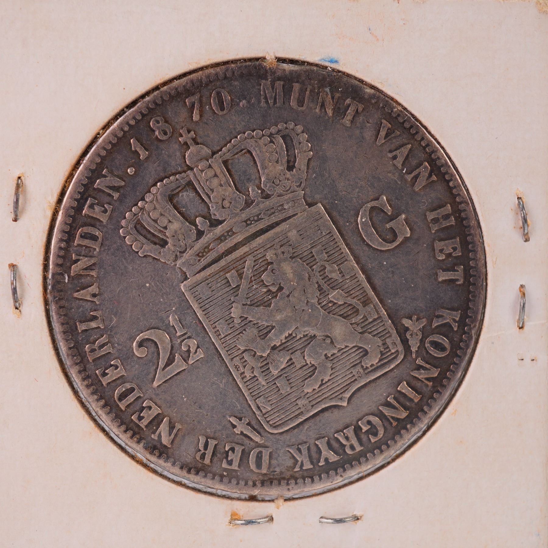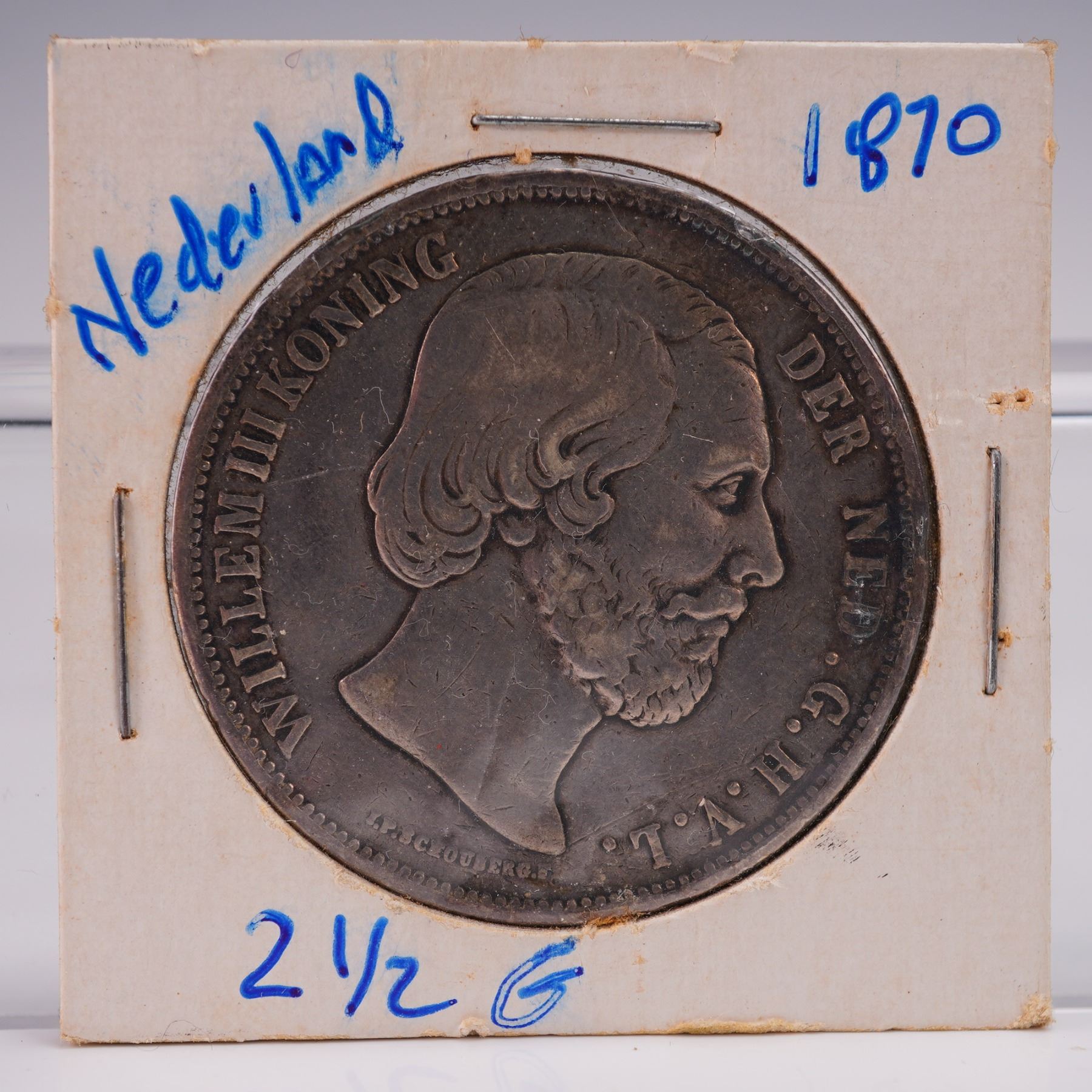 Struck in 1870, this two and a half Gulden coin from the Kingdom of the Netherlands features the right-facing portrait of King Willem III on the obverse, inscribed with WILLEM III KONING DER NED. G. H. V. L. The reverse displays the crowned Dutch coat of arms with a lion holding a sword and arrows, flanked by the denomination two and a half and the letter G. The inscription reads MUNT VAN HET KONINGRYK DER NEDERLANDEN 1870. The coin is composed of silver (0.945 fine) and weighs 25 grams. Coin diameter: 38mm. Coin protector approximately: 2"L x 2"W.