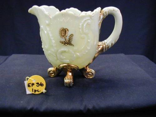 1870 EAPG GREEN CUSTARD 4 FTD. GLASS CREAMER W/ HND PTD GOLD ACCENTS (MINOR PAINT WEAR) EXCELLENT
