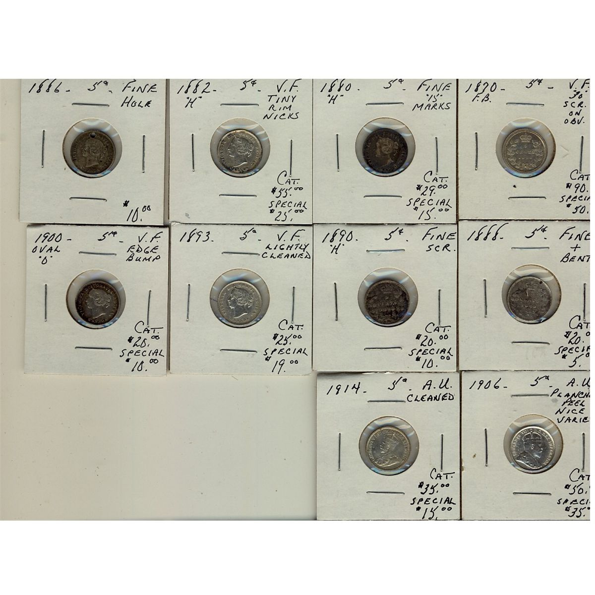 1870 FB 5¢, 1880H, 1882H, 1886, 1888, 1890H, 1893, 1900 Ov, 1906 & 1914. Lot of 10 coins all with p