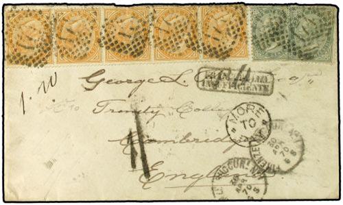 1870 FIRENZE a INGLATERRA. 5 cts. verde gris (2) y 10 cts. bistre (5). Carta con FRANQUEO INSUFICIENTE tasada a la llegada con "1/-". ESPECTACULAR.