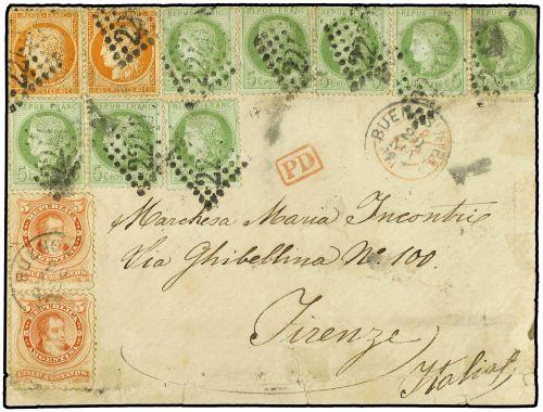 1870 FRONTAL circulado de BUENOS AIRES a ITALIA con sellos Argentinos de 5 cts. (2) y sellos franceses de 5 cts. verde (8) y 40 cts. naranja (2). Excepcional combinación de franqueo, única conocida.
