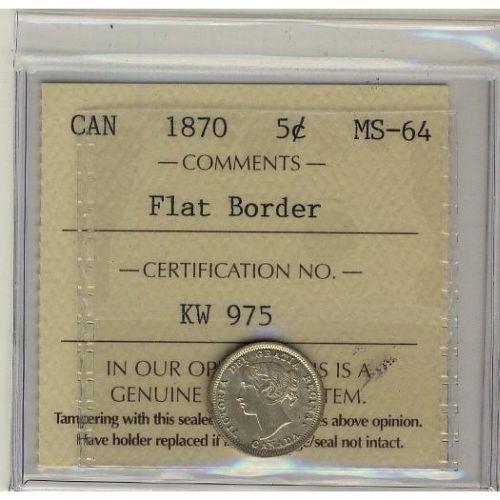 1870 Flat border 5¢ ICCS MS64 PQ+ Brilliant with full luster. Excellent strike with clean fields and nice surfaces. Only 3 finer
