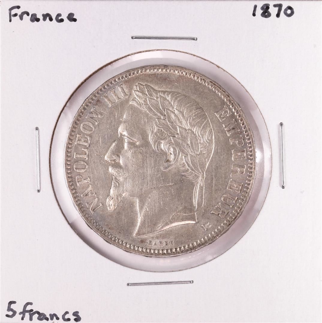One 1870 France 5 Francs Napoleon Silver Coin.