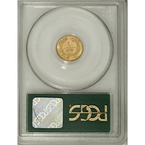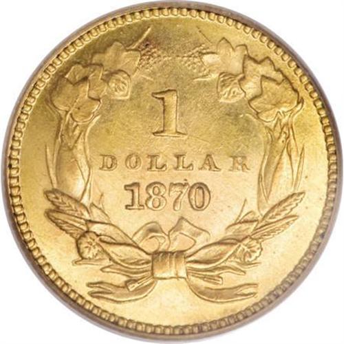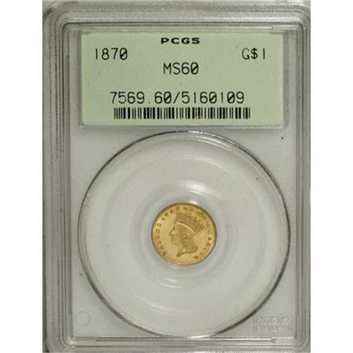 <B>1870 G$1 MS60 PCGS.</B></I> The faintly prooflike surfaces reveal underlying hints of lime-green color, that grow much stronger near the peripheries. Pastel peach accents adorn the central devices. Boldly struck with several die striations (as struck) detected on the reverse. Abrasion-free with a few wispy hairlines that limit the grade.<BR><BR><B>Coin Engraver:</B> James B. Longacre<BR><BR><b>Shipping:</b> Coins & Currency (<a target="_blank" href="http://www.heritageauctions.com/common/shipping.php">view shipping information</a>)