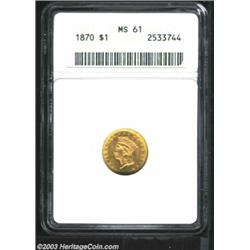 <TABLE cellSpacing=0 cellPadding=0 width="100%" bgColor=#000000 border=0><TBODY><TR><TD width="100%"><TABLE cellSpacing=1 cellPadding=3 width="100%" border=0><TBODY><TR><TD width="100%" bgColor=#79735c><FONT face=arial color=#ffffff size=3><B>Description</B> </FONT></TD></TR><TR><TD width="100%" bgColor=#ffffff><FONT face=arial size=2><B>1870 G$1 MS61 ANACS.</B></I> Well struck aside from the 7 in the date. The 0 in the date is lightly repunched north. Lustrous, bright, and attractive. Only 6,300 pieces were struck, and unlike later low mintage issues in the series, Uncirculated survivors are very scarce. </FONT></TD></TR></TBODY></TABLE></TD></TR></TBODY></TABLE><BR><A name=PricesRealized></A><TABLE cellSpacing=0 cellPadding=0 width="100%" bgColor=#000000 border=0><TBODY><TR><TD width="100%"><TABLE cellSpacing=1 cellPadding=3 width="100%" border=0><TBODY><TR><TD width="100%" bgColor=#79735c><A name=PR><FONT face=arial color=#ffffff size=3><B>Previous Prices from Heritage Auctions</B> </FONT></A></TD></TR><TR><TD bgColor=#f6f6ed><TABLE cellSpacing=0 cellPadding=0 width="100%" border=1><TBODY><TR><TD align=middle width="33%"><B>Date</B></TD><TD align=middle width="33%"><B>Service</B></TD><TD align=middle width="33%"><B>Price</B></TD></TR><TR bgColor=whitesmoke><TD width="33%"><B>02/12/2002</B></TD><TD width="33%">NGC</TD><TD width="33%">$690.00</TD></TR></TBODY></TABLE></TD></TR><TR><TD bgColor=#ffffff><FONT face=arial size=1 ?>PLEASE NOTE: All prices realized reflect the final hammer price PLUS the buyer's premium in auctions that charge a buyer's premium. Each item has a notation at the top of the listing indicating whether that lot included a buyer's premium. Example: A item that sells with a final hammer price of $100 and a 20% buyer's premium will display with a price realized of $120. All information listed is intended to be as accurate as possible, but errors are possible. Please use this guide carefully and inform us of any inaccuracies. </FONT></TD></TR></TBODY></TABLE></TD></TR></TBODY></TABLE><BR><TABLE cellSpacing=0 cellPadding=0 width="100%" bgColor=#000000 border=0><TBODY><TR><TD width="100%"><TABLE cellSpacing=1 cellPadding=3 width="100%" border=0><TBODY><TR><TD width="100%" bgColor=#79735c colSpan=6><FONT face=arial color=#ffffff size=3><B>Price Guide*</B> </FONT></TD></TR><TR bgColor=#f6f6ed><TD align=middle><B>Grade</B> </TD><TD align=middle><B>Coin World<BR>(Trends)</B> </TD><TD align=middle><B>Numismedia<BR>Retail</B> </TD><TD align=middle><B>Numismedia<BR>Wholesale</B> </TD><TD align=middle><B>Coin<BR>Universe</B> </TD><TD align=middle><B>Heritage<BR>Value Index</B> </TD></TR><TR bgColor=#ffffff><TD align=middle>60</TD><TD align=right>$575.00</TD><TD align=right>---</TD><TD align=right>$925.00</TD><TD align=right>$950.00</TD><TD align=right>$546.33</TD></TR><TR style="FONT-WEIGHT: bold" bgColor=#cccfdd><TD align=middle>61</TD><TD align=right>---</TD><TD align=right>---</TD><TD align=right>$1,000.00</TD><TD align=right>---</TD><TD align=right>$671.50</TD></TR><TR bgColor=#ffffff><TD align=middle>62</TD><TD align=right>$975.00</TD><TD align=right>---</TD><TD align=right>$1,125.00</TD><TD align=right>$1,300.00</TD><TD align=right>$902.00</TD></TR><TR bgColor=#ffffff><TD colSpan=6><FONT size=1>*All information listed is intended to be as accurate as possible, but errors are possible. No item may be returned or refused based on this information which is provided as a service to our customers. You should contact each pricing source directly to determine the accuracy of this information. </FONT></TD></TR></TBODY></TABLE></TD></TR></TBODY></TABLE><BR><TABLE cellSpacing=0 cellPadding=0 width="100%" bgColor=#000000 border=0><TBODY><TR><TD width="100%"><TABLE cellSpacing=1 cellPadding=3 width="100%" border=0><TBODY><TR><TD width="100%" bgColor=#79735c><FONT face=arial color=#ffffff size=3><B>Population Guide</B> </FONT></TD></TR><TR bgColor=#ffffff><TD align=middle><!-- Begin Output of Population Grid--><TABLE cellSpacing=0 cellPadding=0 width="100%" border=0><TBODY><TR><TD vAlign=center><TABLE cellSpacing=0 width="100%" border=1 cellsadding="3"><TBODY><TR><TD vAlign=center><TABLE cellSpacing=0 cellPadding=3 width="100%" border=1><TBODY><TR><TD vAlign=center align=middle bgColor=#f0f1e8 colSpan=2 <CENTER><FONT face=Arial size=2><B>PCGS Pop </B></FONT><CENTER></CENTER></TD><TD vAlign=center align=middle bgColor=#f0f1e8 colSpan=2><CENTER><FONT face=Arial size=2><B>NGC Pop</B></CENTER></FONT></TD></TR><TR><TD vAlign=center><FONT face=Arial size=2>(61)</FONT> </TD><TD vAlign=center align=right><FONT face=Arial size=2>5</FONT> </TD><TD vAlign=center><FONT face=Arial size=2>(61)</FONT> </TD><TD vAlign=center align=right><FONT face=Arial size=2>11</FONT> </TD></TR><TR><TD vAlign=center><FONT face=Arial size=2>(>61)</FONT> </TD><TD vAlign=center align=right><FONT face=Arial size=2>56</FONT> </TD><TD vAlign=center><FONT face=Arial size=2>(>61)</FONT> </TD><TD vAlign=center align=right><FONT face=Arial size=2>57</FONT> </TD></TR></TBODY></TABLE></TD></TR></TBODY></TABLE></TD></TR></TBODY></TABLE><!-- End Output of Population Grid--> Important notice: Heritage usually auctions material at the rate of 200-250 lots per hour. On some occasions eBay Live bid software or the Internet may not be able to keep up with the pace of the auction. We recommend placing a realistic absentee bid now as insurance to avoid disappointment. Occasionally the auctioneer may eliminate or reject an eBay Live bid, and the auctioneer may also reopen a lot after the close of the eBay live bidding (usually because we missed an audience bid), and may reject your bid even if it shows you as the winning bidder. By bidding via eBay Live, you agree that Heritage may award the lot to another bidder at its sole discretion under the circumstances described above or any other reasonable circumstances. Also please note that all Heritage lots purchased through eBay Live carry a 20% Buyer's Premium. Please make sure you read the