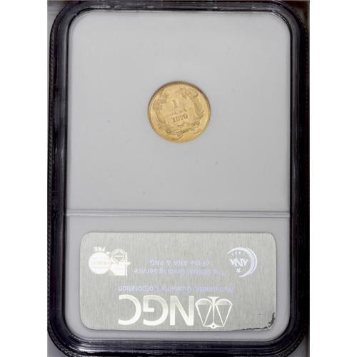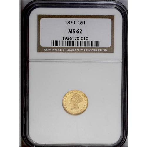 <B>1870<G$1> MS62 NGC.</B></I> An attractive example of this low mintage Type Three gold dollar. Satiny and slightly reflective with a solid strike over most of the coin. Census: 21 in 62, 42 finer (7/06).<BR><I>From The Derrick Snider Collection.</B></I>