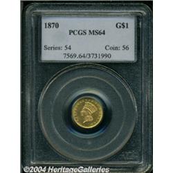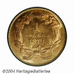 <table><tbody><tr><td><table> <TR><TD width="100%"><TABLE cellSpacing=1 cellPadding=3 width="100%" border=0><TBODY><TR><TD width="100%" bgColor=#79735c><FONT face=arial color=#ffffff size=3><B>Description</B> </FONT></TD></TR><TR><TD width="100%" bgColor=#ffffff><FONT face=arial size=2><B>1870 G$1 MS64 PCGS.</B></I> This is a reddish-gold example with modest traces of brightness in the fields. Neither side reveals any abrasions that would seem to rule out an even higher grade. The low mintage 1870 (6,300 business strikes and 35 proofs produced) is scarce in the finer Mint State grades. </FONT></TD></TR></TBODY></TABLE></TD></TR></TBODY></TABLE><BR><A name=PricesRealized></A><TABLE cellSpacing=0 cellPadding=0 width="100%" bgColor=#000000 border=0><TBODY><TR><TD width="100%"><TABLE cellSpacing=1 cellPadding=3 width="100%" border=0><TBODY><TR><TD width="100%" bgColor=#79735c><A name=PR><FONT face=arial color=#ffffff size=3><B>Previous Prices from Heritage Auctions</B> </FONT></A></TD></TR><TR><TD bgColor=#f6f6ed><TABLE cellSpacing=0 cellPadding=0 width="100%" border=1><TBODY><TR><TD align=middle width="33%"><B>Date</B></TD><TD align=middle width="33%"><B>Service</B></TD><TD align=middle width="33%"><B>Price</B></TD></TR><TR bgColor=whitesmoke><TD width="33%"><B>03/23/2003</B></TD><TD width="33%">PCGS</TD><TD width="33%">$1,610.00</TD></TR><TR bgColor=whitesmoke><TD width="33%"><B>05/01/2001</B></TD><TD width="33%">PCGS</TD><TD width="33%">$1,725.00</TD></TR></TBODY></TABLE></TD></TR><TR><TD bgColor=#ffffff><FONT face=arial size=1 ?>PLEASE NOTE: All prices realized reflect the final hammer price PLUS the buyer's premium in auctions that charge a buyer's premium. Each item has a notation at the top of the listing indicating whether that lot included a buyer's premium. Example: A item that sells with a final hammer price of $100 and a 20% buyer's premium will display with a price realized of $120. All information listed is intended to be as accurate as possible, but errors are possible. Please use this guide carefully and inform us of any inaccuracies. </FONT></TD></TR></TBODY></TABLE></TD></TR></TBODY></TABLE><BR><TABLE cellSpacing=0 cellPadding=0 width="100%" bgColor=#000000 border=0><TBODY><TR><TD width="100%"><TABLE cellSpacing=1 cellPadding=3 width="100%" border=0><TBODY><TR><TD width="100%" bgColor=#79735c colSpan=6><FONT face=arial color=#ffffff size=3><B>Price Guide*</B> </FONT></TD></TR><TR bgColor=#f6f6ed><TD align=middle><B>Grade</B> </TD><TD align=middle><B>Coin World<BR>(Trends)</B> </TD><TD align=middle><B>Numismedia<BR>Retail</B> </TD><TD align=middle><B>Numismedia<BR>Wholesale</B> </TD><TD align=middle><B>Coin<BR>Universe</B> </TD><TD align=middle><B>Heritage<BR>Value Index</B> </TD></TR><TR bgColor=#ffffff><TD align=middle>63</TD><TD align=right>$1,800.00</TD><TD align=right>---</TD><TD align=right>$1,400.00</TD><TD align=right>$1,750.00</TD><TD align=right>$1,258.75</TD></TR><TR style="FONT-WEIGHT: bold" bgColor=#cccfdd><TD align=middle>64</TD><TD align=right>$2,500.00</TD><TD align=right>---</TD><TD align=right>$2,450.00</TD><TD align=right>$2,700.00</TD><TD align=right>$1,861.25</TD></TR><TR bgColor=#ffffff><TD align=middle>65</TD><TD align=right>$5,000.00</TD><TD align=right>---</TD><TD align=right>$4,250.00</TD><TD align=right>$5,000.00</TD><TD align=right>$3,547.50</TD></TR><TR bgColor=#ffffff><TD colSpan=6><FONT size=1>*All information listed is intended to be as accurate as possible, but errors are possible. No item may be returned or refused based on this information which is provided as a service to our customers. You should contact each pricing source directly to determine the accuracy of this information. </FONT></TD></TR></TBODY></TABLE></TD></TR></TBODY></TABLE><BR><TABLE cellSpacing=0 cellPadding=0 width="100%" bgColor=#000000 border=0><TBODY><TR><TD width="100%"><TABLE cellSpacing=1 cellPadding=3 width="100%" border=0><TBODY><TR><TD width="100%" bgColor=#79735c><FONT face=arial color=#ffffff size=3><B>Population Guide</B> </FONT></TD></TR><TR bgColor=#ffffff><TD align=middle><!-- Begin Output of Population Grid--><TABLE cellSpacing=0 cellPadding=0 width="100%" border=0><TBODY><TR><TD vAlign=center><TABLE cellSpacing=0 width="100%" border=1 cellsadding="3"><TBODY><TR><TD vAlign=center><TABLE cellSpacing=0 cellPadding=3 width="100%" border=1><TBODY><TR><TD vAlign=center align=middle bgColor=#f0f1e8 colSpan=2 <CENTER><FONT face=Arial size=2><B>PCGS Pop </B></FONT><CENTER></CENTER></TD><TD vAlign=center align=middle bgColor=#f0f1e8 colSpan=2><CENTER><FONT face=Arial size=2><B>NGC Pop</B></CENTER></FONT></TD></TR><TR><TD vAlign=center><FONT face=Arial size=2>(64)</FONT> </TD><TD vAlign=center align=right><FONT face=Arial size=2>16</FONT> </TD><TD vAlign=center><FONT face=Arial size=2>(64)</FONT> </TD><TD vAlign=center align=right><FONT face=Arial size=2>17</FONT> </TD></TR><TR><TD vAlign=center><FONT face=Arial size=2>(>64)</FONT> </TD><TD vAlign=center align=right><FONT face=Arial size=2>18</FONT> </TD><TD vAlign=center><FONT face=Arial size=2>(>64)</FONT> </TD><TD vAlign=center align=right><FONT face=Arial size=2>9</FONT> </TD></TR></TBODY></TABLE></TD></TR></TBODY></TABLE></TD></TR></TBODY></TABLE><!-- End Output of Population Grid--></TD></TR></TBODY></TABLE></TD></TR></TBODY></TABLE><BR><TABLE cellSpacing=0 cellPadding=0 width="100%" bgColor=#000000 border=0><TBODY><TR> <font color='#000000'><span style='background-color: #FFFFFF'><td bgcolor='#FFFFFE'> Important notice: Heritage usually auctions material at the rate of 200-250 lots per hour. On some occasions eBay Live bid software or the Internet may not be able to keep up with the pace of the auction. We recommend placing a realistic absentee bid now as insurance to avoid disappointment. Occasionally the auctioneer may eliminate or reject an eBay Live bid, and the auctioneer may also reopen a lot after the close of the eBay live bidding (usually because we missed an audience bid), and may reject your bid eve
