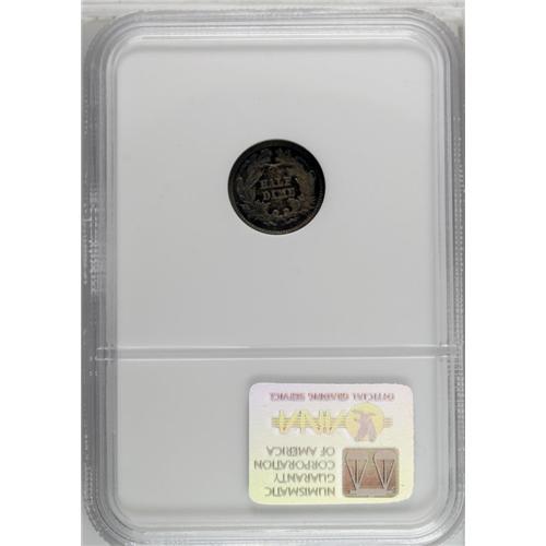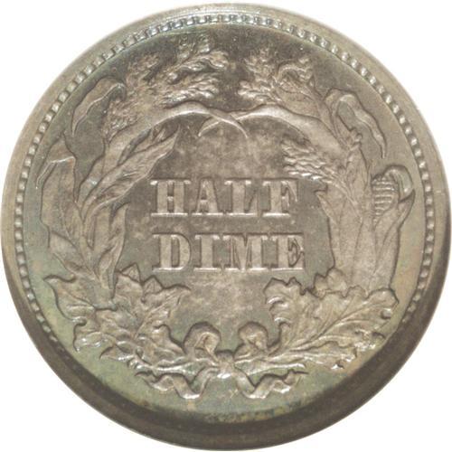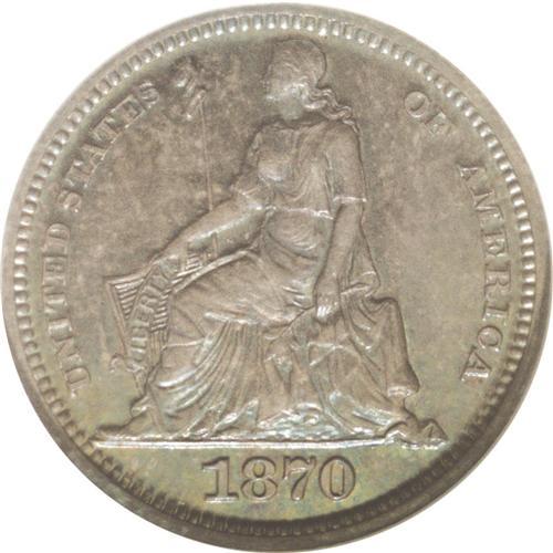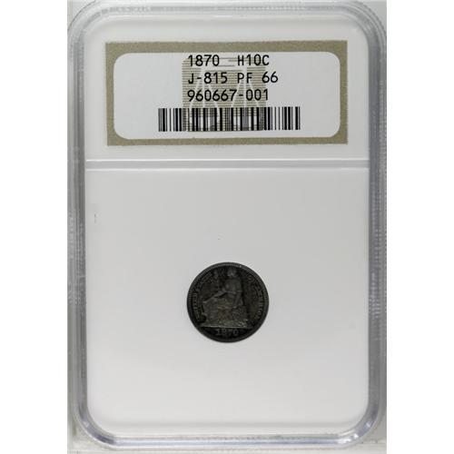<B>1870<H10C> Half Dime, Judd-815, Pollock-904, Low R.7, PR66 NGC.</B></I> William Barber's Seated Liberty design. She faces left, with a shield in her right hand and free-standing liberty pole behind. The reverse is the same design used to coin contemporary regular issue half dimes. Struck in silver with a reeded edge. The iridescent violet-blue and gold patina is especially attractive when tilted under a light. A crisply struck and well preserved rarity.