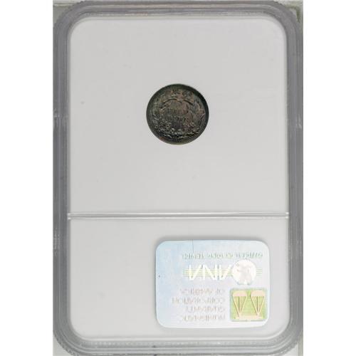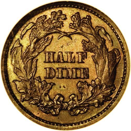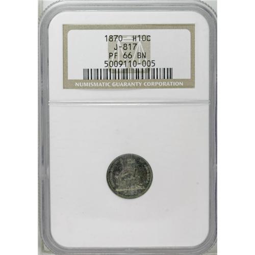 <B>1870<H10C> Half Dime, Judd-817, Pollock-906, High R.6, PR66 Brown NGC.</B></I> A seated figure of Liberty, designed by William Barber, faces left with a globe and free-standing liberty pole. The reverse is the same design used to coin regular issue 1870 half dimes. Struck in copper with a reeded edge. Well struck throughout, the surfaces have a deep gray-brown cast overall with iridescent rose and sea-green undertones. Minor carbon decides the grade.